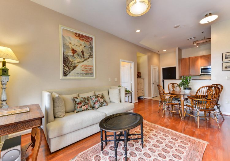 The unit itself boasts two spacious suites with walk-in closets and full en-suite baths. An open floorplan, hardwood floors, breakfast bar, high ceilings and two balconies with a view to the world make this upper-level condo feel like the perfect space to relax and call home. The kitchen, complete with granite counters, gas cooking, maple cabinets, and stainless steel appliances, is open to the dining area and living room, and there’s the perfect bar nook for cocktail hour! An in-unit washer/dryer completes the space.