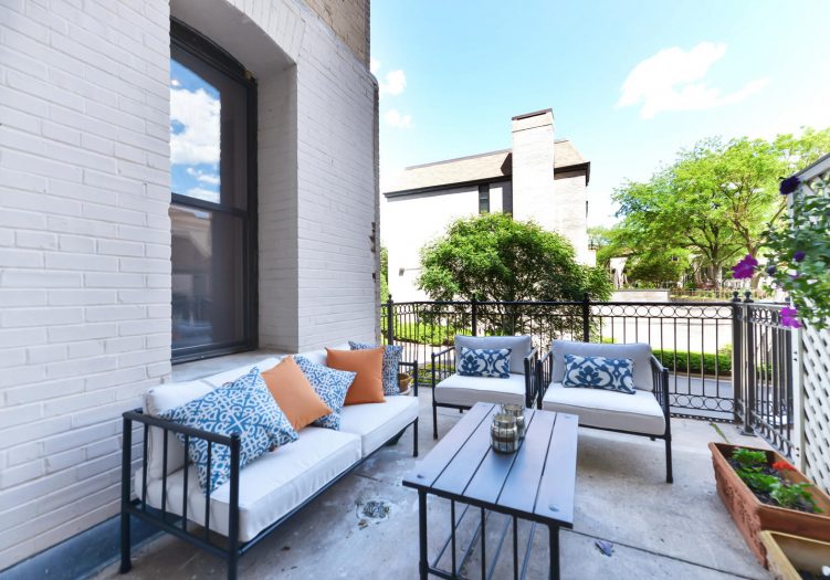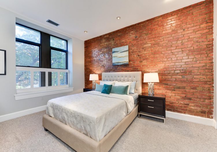 Inside, find a stunning just-renovated kitchen, complete with new cabinets, new countertops, new flooring, under counter lights and a beautiful sea-glass tiled backsplash. In the large living room and separate dining room, 10’ high ceilings float over the exposed brick wall and hardwood floors.