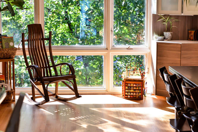 Perfect for entertaining, the beautiful back yard and patio space leads to two private parking spaces. Upstairs, the master bedroom boasts an Elfa closet system and huge picture windows with views of the pines. The second upper bedroom looks out to the yard, and a full bath completes the floor. The third bedroom (or living room/den) and another full bath are on the first floor walk-in level at the front of the home, and the space is bathed in radiant sunlight with a view to the verdant green path outside.